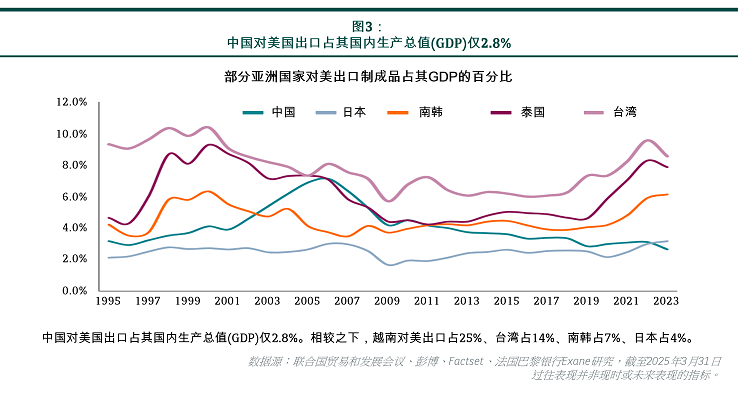中国对美国出口占其国内生产总值(GDP)仅2.8%。相较之下,越南对美出口占25%﹑台湾占14%﹑韩国占7%﹑日本占4%。