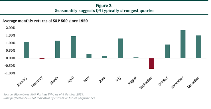 Credit spreads are tight, and the US dollar has weakened. This combination boosts global liquidity and allows emerging market central banks to join in the rate-cutting cycle. The loosening of financial conditions is typically a leading indicator, though it tends to act with a lag. As a result, global equities could see a further boost in the fourth quarter, despite already strong performance year-to-date.