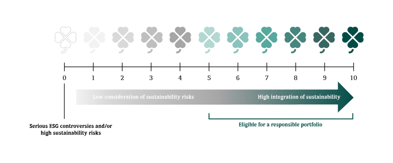 The evaluation helps to position all financial instruments recommended by BNP Paribas Wealth Management on a scale of 0 to 10 Clovers, within each asset class, whether the products are responsible or not.